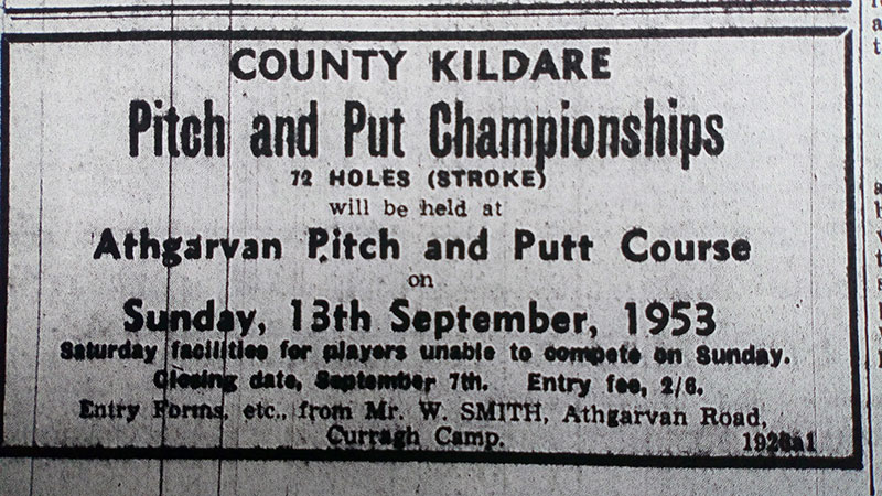 On Sunday 13th Septetember 1953 the Athgarvan course played host to the Co. Kildare Pitch and Putt Championships. In perfect weather, 60 competitors took part. Playing in parties of 3, they set off from the 1st tee box with clockwork regularity. With huge crowds of spectators along to watch, they would give a fine display of skill and determination. As the day progressed and competitors dwindled to the remaining few, it was set to be a gripping finale. At the three quarter stage mark the leading positions were Stephen Byrne (Athgarvan), P. Brady (Athgarvan) and Corporal Maguire (Plunkett). The first of this trio to falter was P. Brady. The remaining two set off for their final round and after a fierce battle of wits S. Byrne was the the triumphant finalist who beat his opponent comfortably in the end. A proud day for the Athgarvan Club.